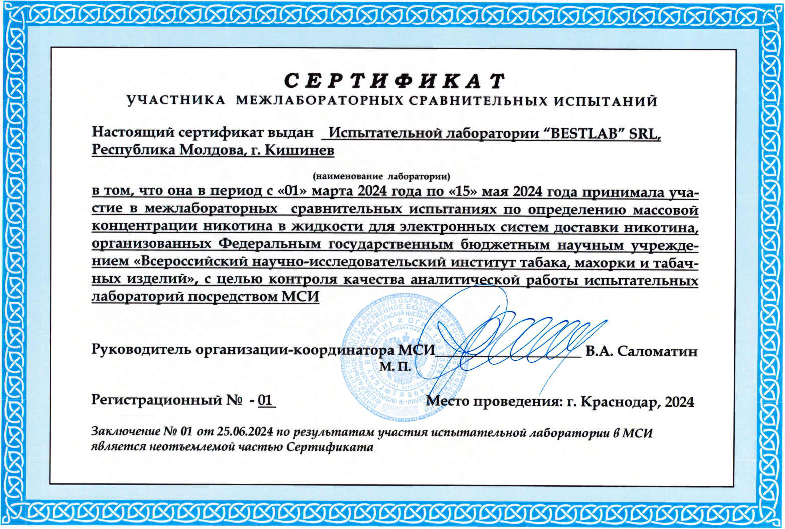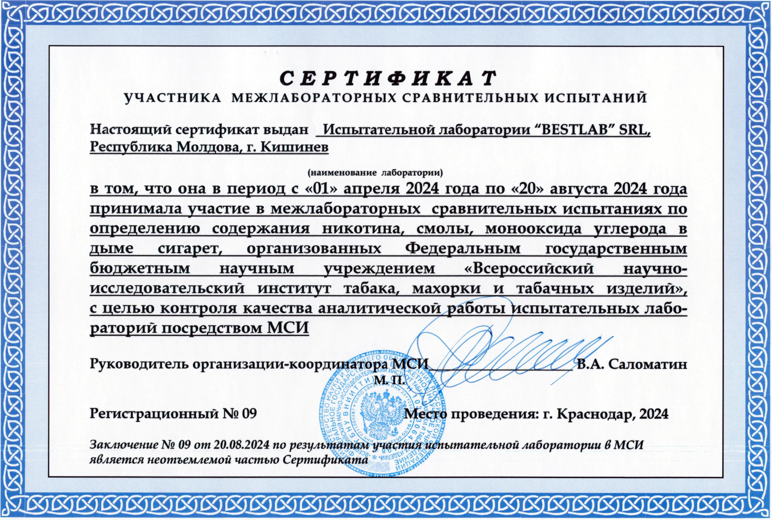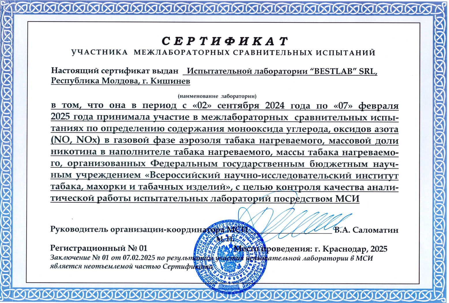 În anul 2024, laboratorul BestLab a participat la trei runde de testări interlaboratoare organizate de Instituția Științifică Federală de Stat – Institutul de Cercetare Științifică a Tutunului și a Produselor din Tutun din Federația Rusă, orașul Krasnodar.
